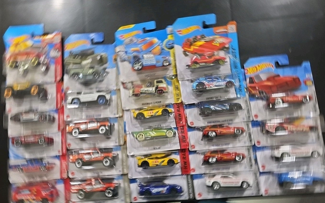 This Hot Wheels bundle includes 27 mixed cars from various series, with a scale of 1:64. The die-cast vehicles feature a colourful design and are made in Malaysia. This job lot may contain 1 or 2 poor cards, but the rest of the collection is in good condition. Perfect for Hot Wheels enthusiasts looking to add a mix of vehicles to their collection, this bundle offers a variety of car models in a 1:64 scale.